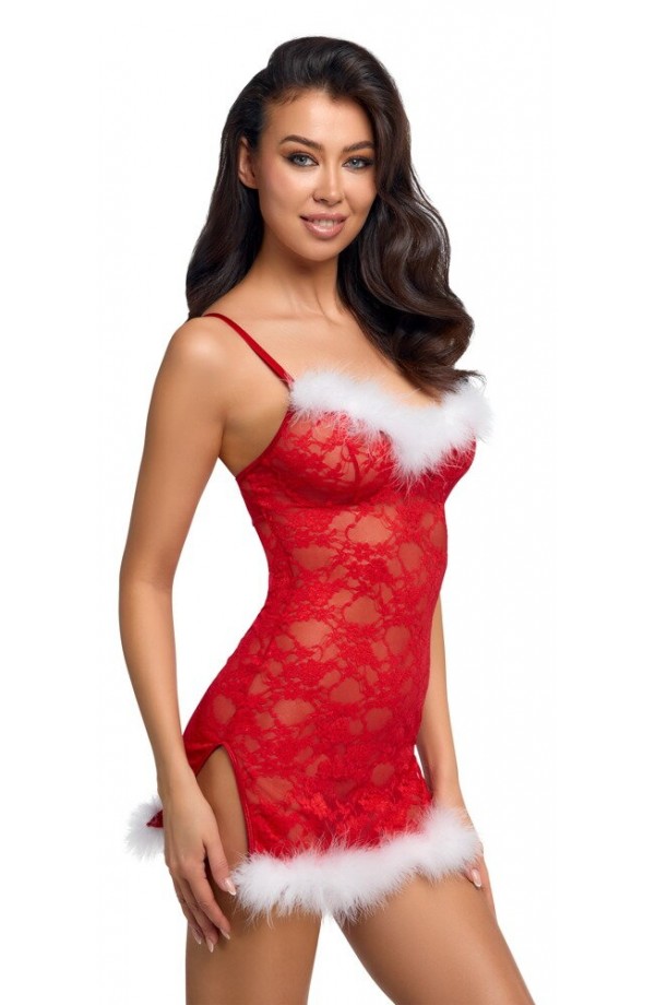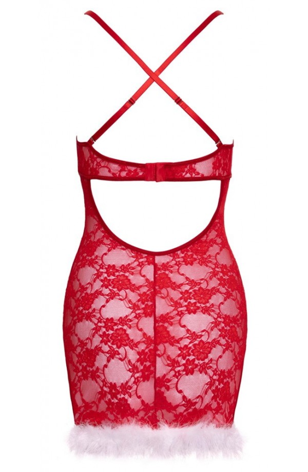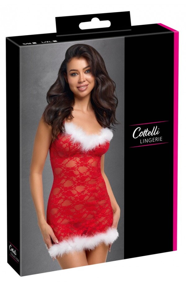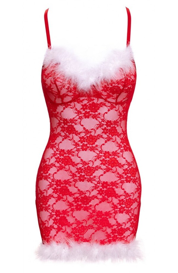 The tight-fitting chemise, X-Mas from Cottelli LINGERIE, is made out of delicate red lace. It is soft and stretchy for a very comfortable fit. Delicate white feathers decorate the wireless cups and hem. There is a slit at either side of the chemise for better movement. The bra straps are in a criss-cross design at the back. The bra straps and the strap at the back with a hook fastener can be adjusted to fit.