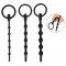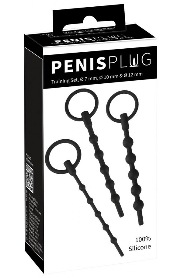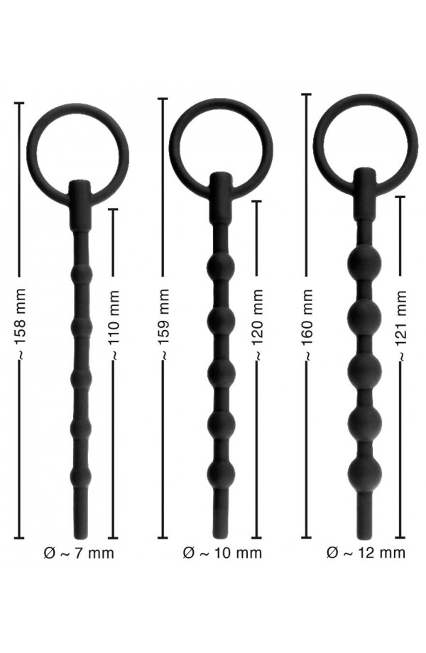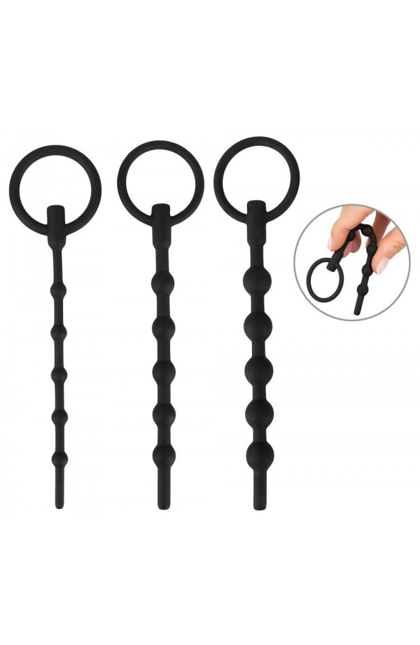 Penis plug training set with 3 different dilators. All three are made out of velvety soft silicone and they each have stimulating beads in different diameters. Each bead dilator has a rounded tip and a retraction ring for easy insertion and removal. They are also bendable and flexible for gentle, comfortable use and optimal adjustment.