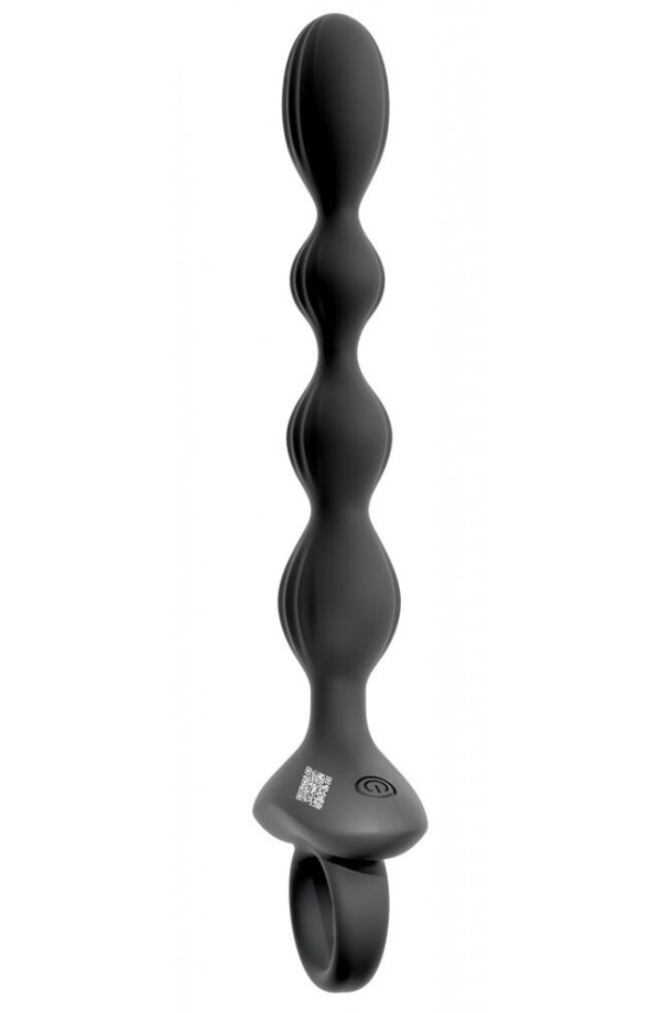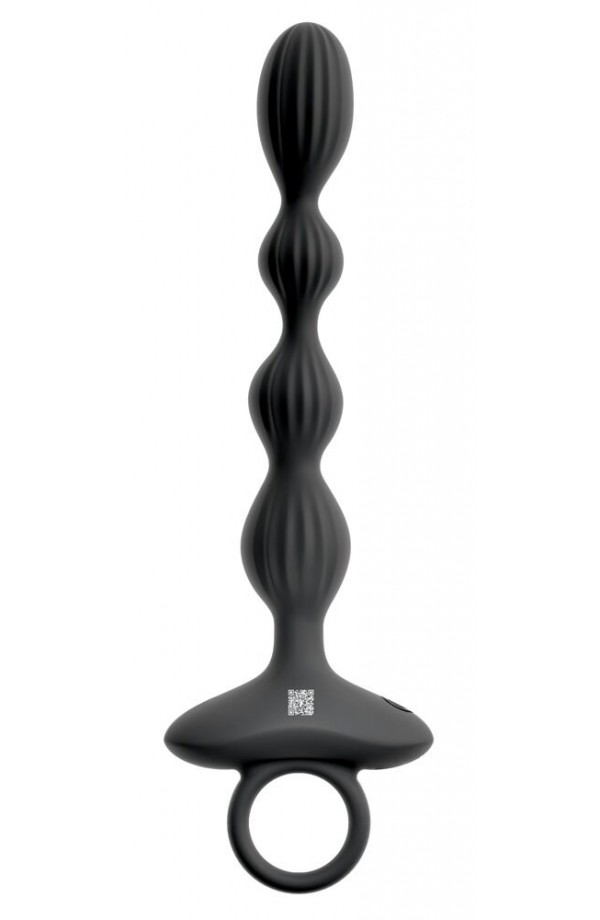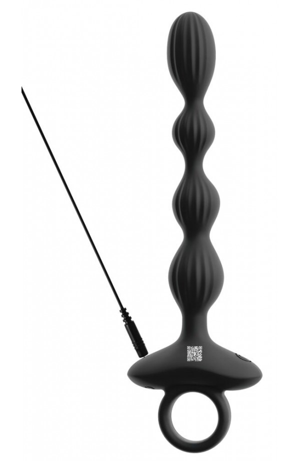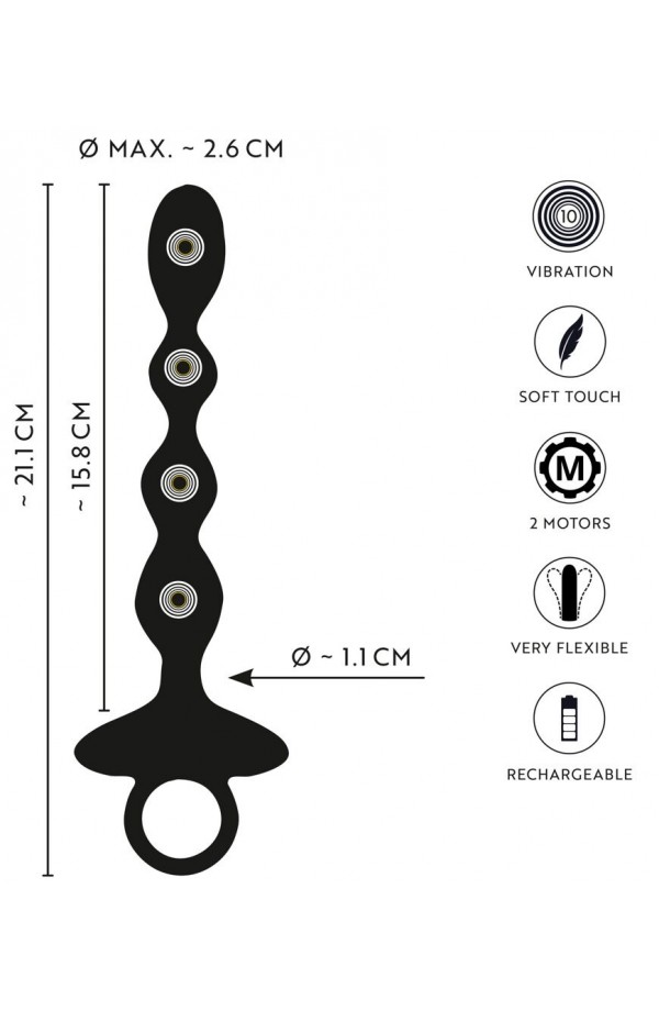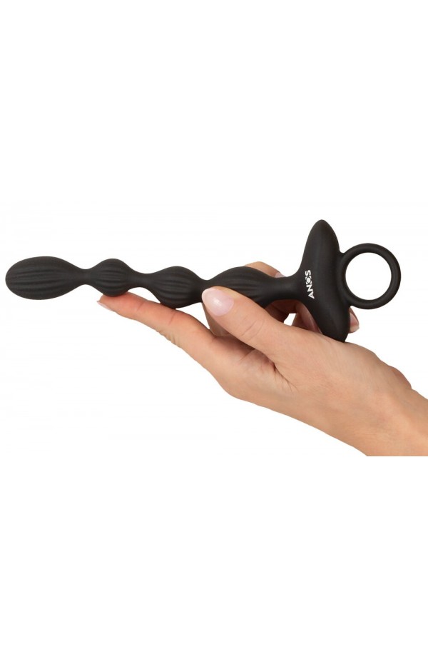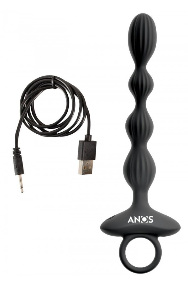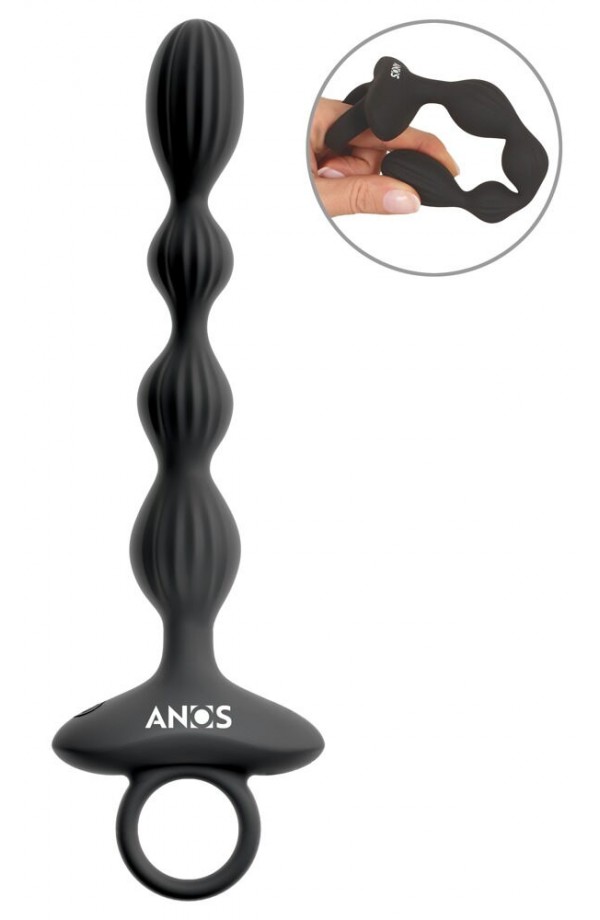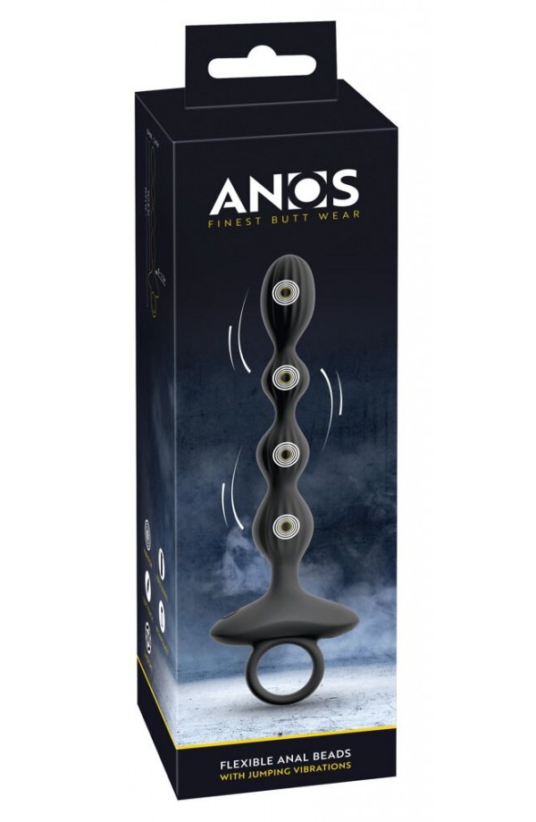 Anal beads with 2 motors 4 vibro-balls with a grooved texture 10 vibration modes Incl. a surprise mode (Jumping) Very flexible – adapts perfectly Anal-safe stopper with a ring-shaped handle Velvety soft silicone Rechargeable – USB cable included Amazing anal adventures with jumping vibrations! The Flexible Anal Beads with Jumping Vibrations from ANOS are perfect for deep, intense backdoor fun. The flexible anal beads provide stimulation with their 4 grooved vibro-beads. The beads have two motors for 10 powerful vibration modes, which can be easily controlled at the push of a button. There is also a special mode for the jumping vibrations – the impulses jump from one vibrating bead to the next. For exciting surprise effects during anal play! The beads are made out of silicone with a silky-smooth texture, which means that each bead will slide in gently. The beads are extremely flexible and they adapt perfectly to play too. The tapered design means that they stay securely inside the anus. The wide stopper with the practical ring-shaped handle means that the beads are easy to guide and remove in a pleasurable way, and it also stops the beads from sliding in too far as well. Maximum comfort for solo anal play and fun for two! Rechargeable – includes a USB cable. Total length 21.1 cm, insertion length 15.8 cm, Ø of ball max. 2.6 cm, Ø of tapered part 1.1 cm. Weight 93 g. Silicone.