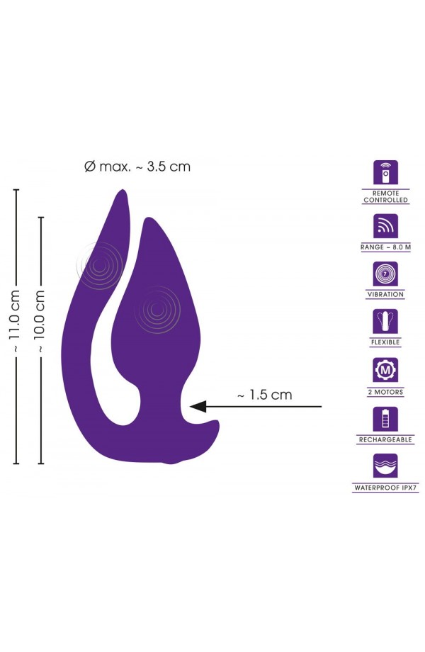 The 2 quiet but powerful motors provide 7 diverse vibration modes in both stimulators. The vibration modes can be controlled by the wearer or a partner easily via the remote control (range up to 8 metres). The vibration modes can also be controlled directly on the toy as well. It can even be enjoyed in the bath or the shower because it is waterproof.
