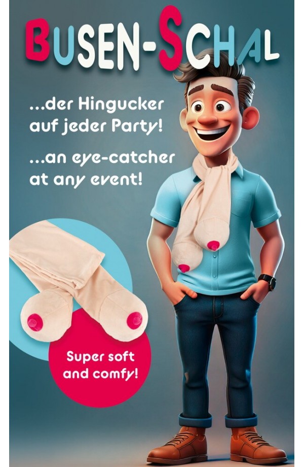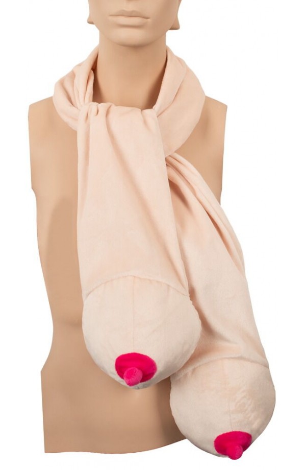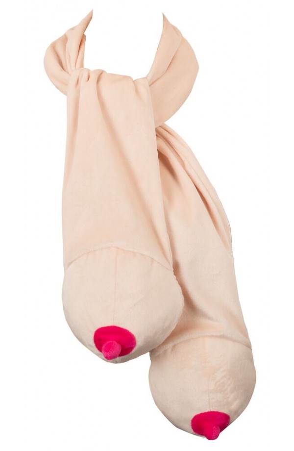 This nude-coloured boob scarf has a large, soft boob with a pink nipple at either end. The scarf is wonderfully soft, fluffy and lightweight. It is long enough to fit any neck so that the boobs hang at the right height. It is a great cheeky eye-catcher for carnival/Mardi Gras, parties, hen/stag parties, etc.