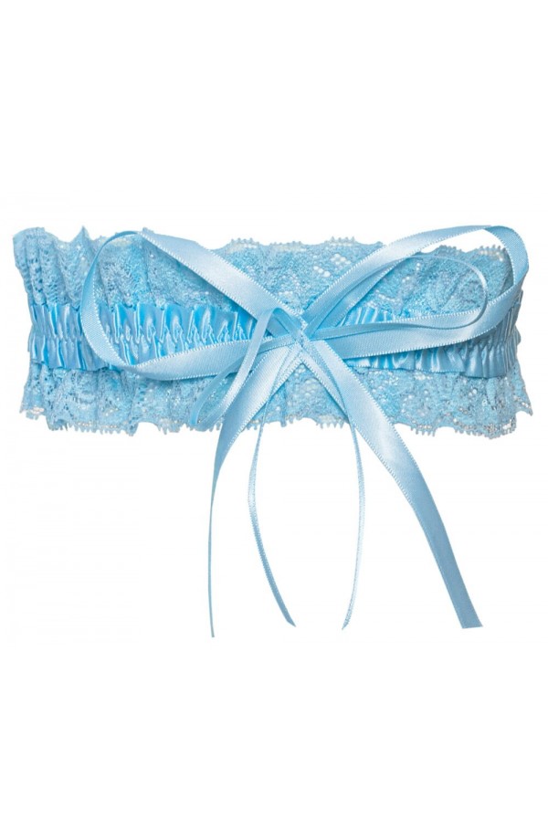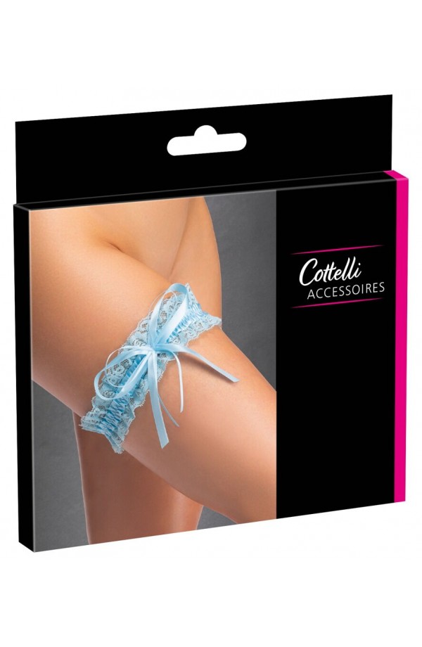 Stretchy garter Soft, light blue lace Integrated stretchy strap for a perfect fit With a decorative satin bow The delicate extra for special moments! The light blue, 5.5 cm wide garter from Cottelli ACCESSOIRES is made out of soft and stretchy lace. It also has an integrated stretchy strap for a perfect fit. With a decorative satin bow. 90% polyamide, 10% spandex.