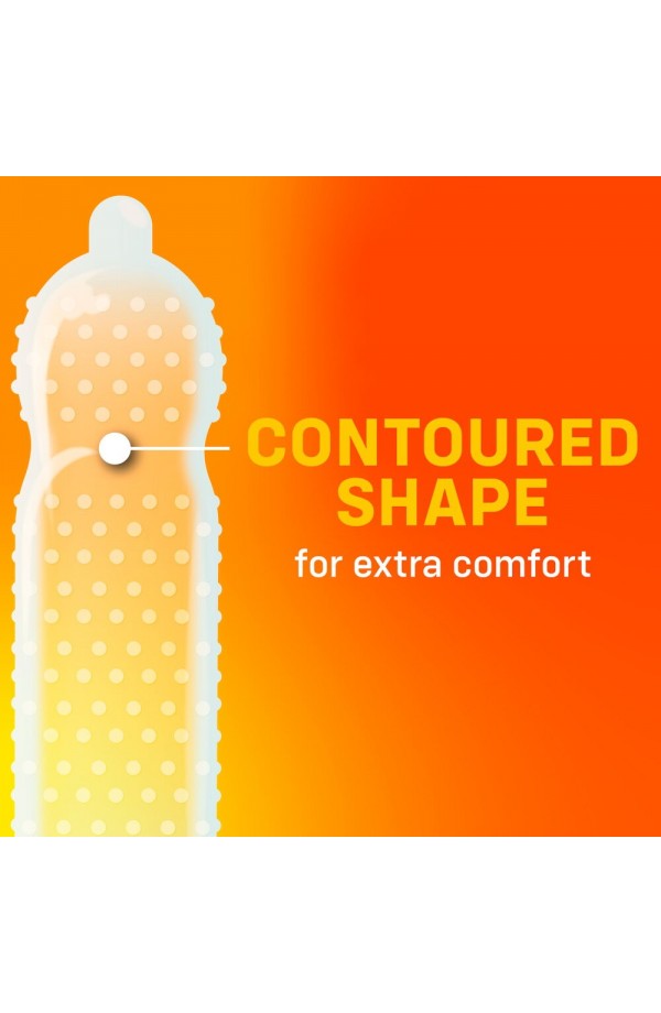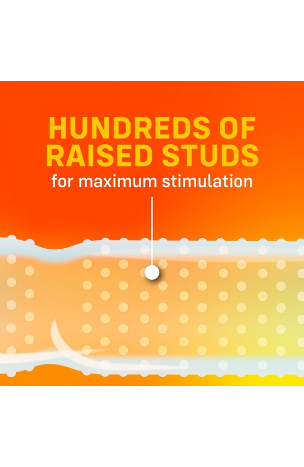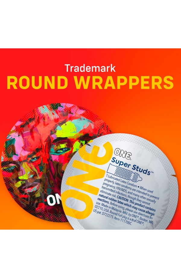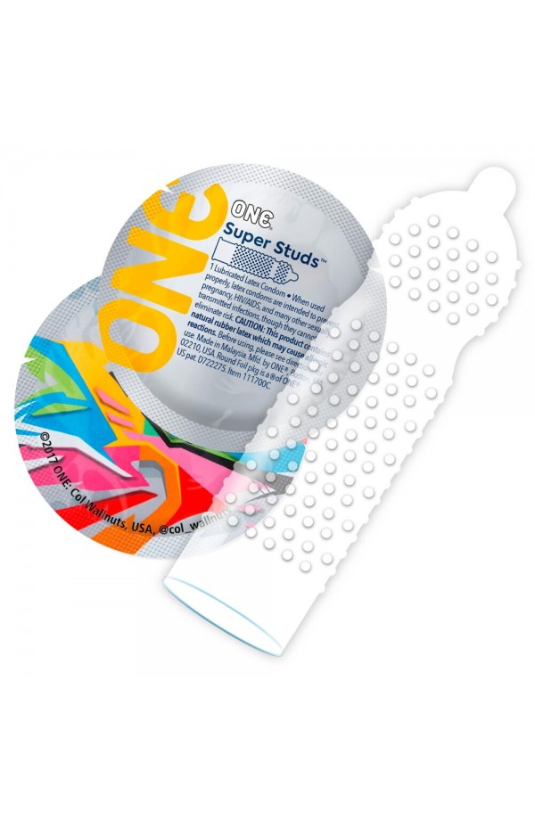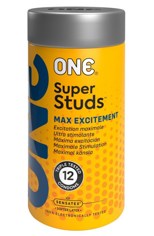 Transparent condoms With large dots Intense stimulation, more pleasure Extremely soft Sensatex latex Covered in silicone oil Vegan, genetically unmodified Extra large dots for maximum pleasure! The transparent condoms, Super Studs from ONE, have large dots for intense stimulation and more pleasure. The contoured shape with a teat-end means that they are a perfect and comfortable fit – the extremely soft Sensatex natural rubber latex provides a natural feeling of pleasure. They are vegan and genetically unmodified. Covered in silicone oil. Length 180 mm, nominal width 53 mm. Pack of 12.