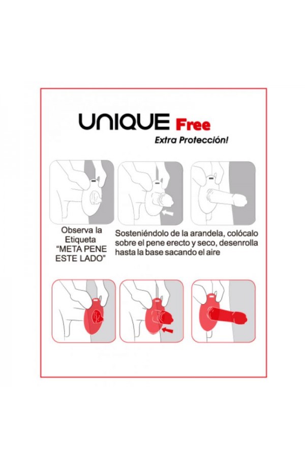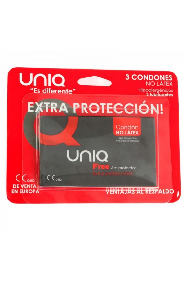 Uniq Free condoms with a specially designed base are made for added protection while enjoying a natural sexual sensation. Made of latex-free and very resistant material. The free protective ring at the base facilitates and speeds donning, isolates the external genital areas and prevents pregnancy and the spread of sexually transmitted diseases. Hypoallergenic, transparent, lubricated and odorless condoms that adhere gently to the skin for maximum comfort and pleasure.