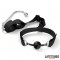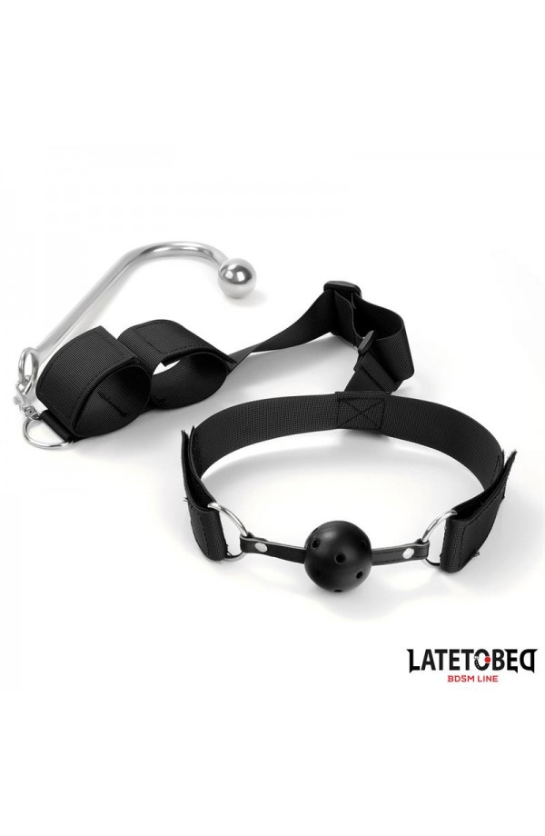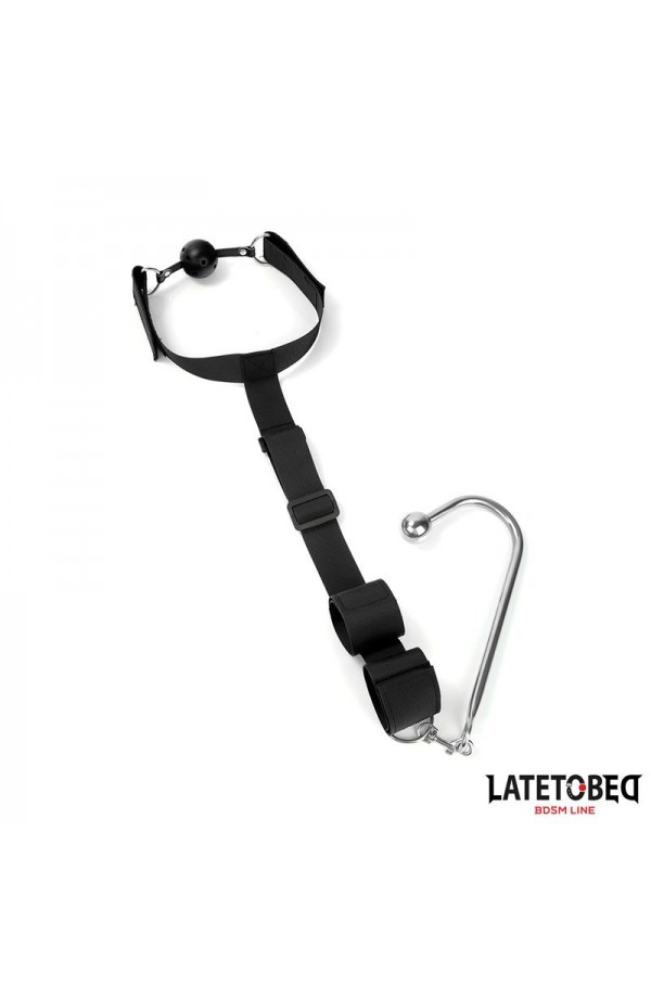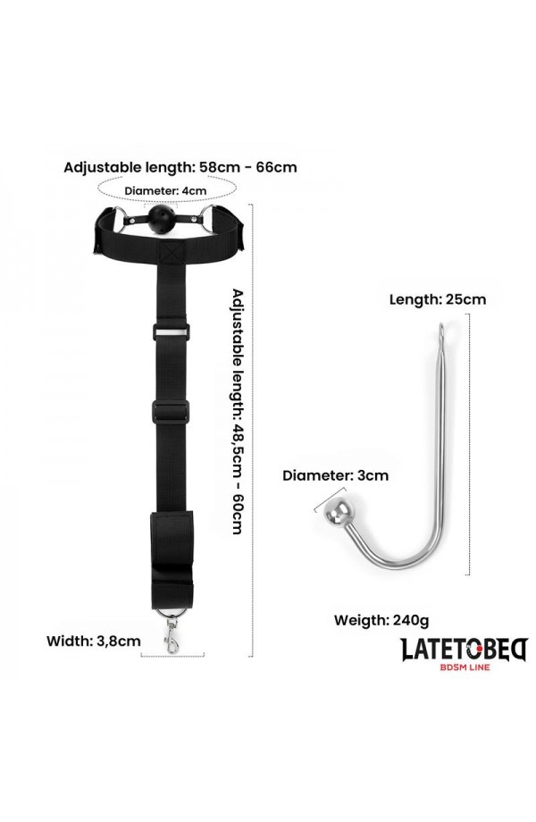 Complete restraints. It has three parts: a gag with a semi-collar on the top, adjustable handcuffs placed on the back on the other end, and a butt hook on the bottom. Keep your submissive always in line with these restraints. You can remove the hook and ball of the gag whenever you want; they are completely removable.
