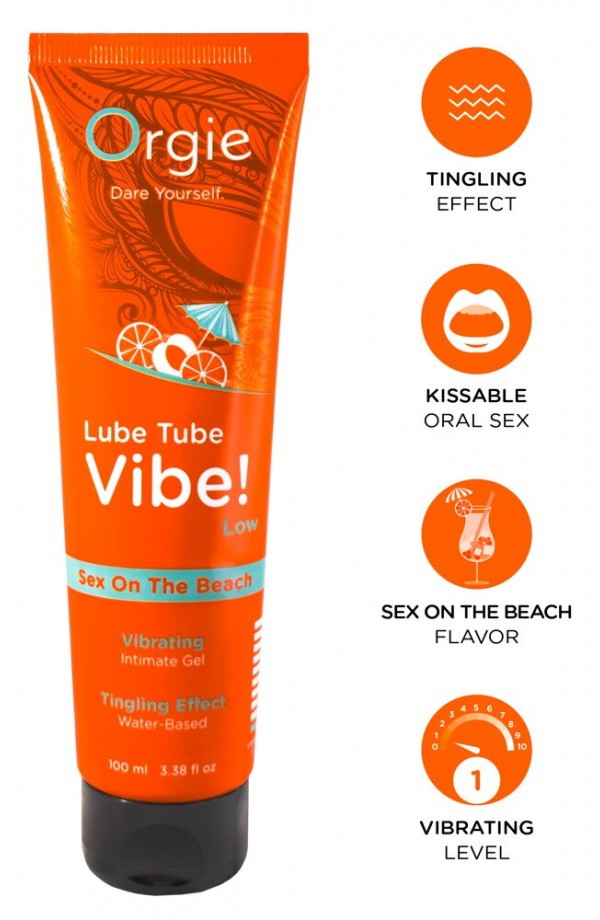 The edible, water-based Vibrating Intimate Gel Lube Tube Vibe! from Orgie has a tingling effect and an irresistible flavour – a tropical, fruity Sex on the Beach cocktail flavour. The gel has a velvety, non-sticky texture for long-lasting & comfortable pleasure during solo fun, foreplay and intercourse. During oral sex, the cocktail flavour tickles the taste buds, while the tingling vibration effect (level 1/10) adds an extra layer of excitement.
