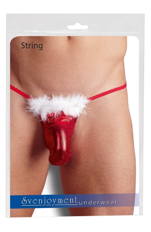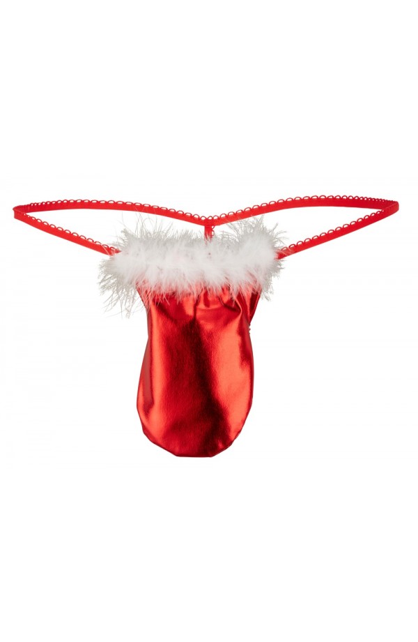 String in a metallic look With soft feathers on the waistband Stretchy A special Christmas gift… String made out of red metallic fabric. With white feathers. 100% polyester. Contains non-textile parts of animal origin.