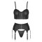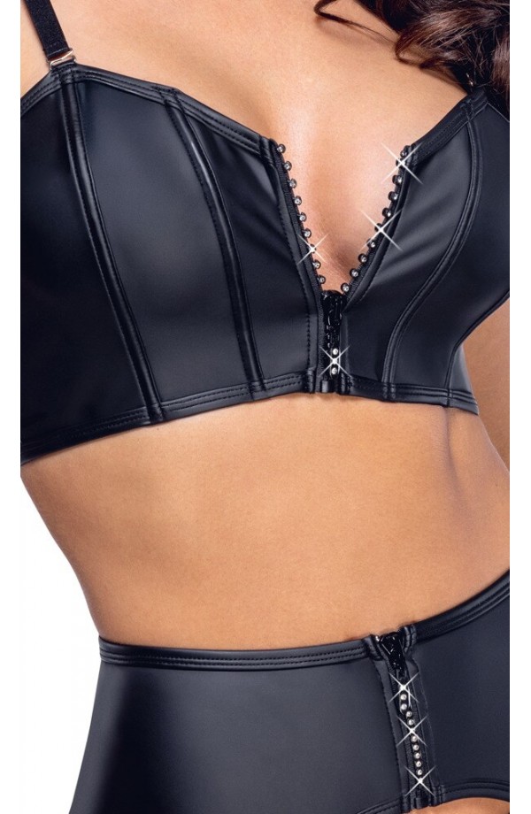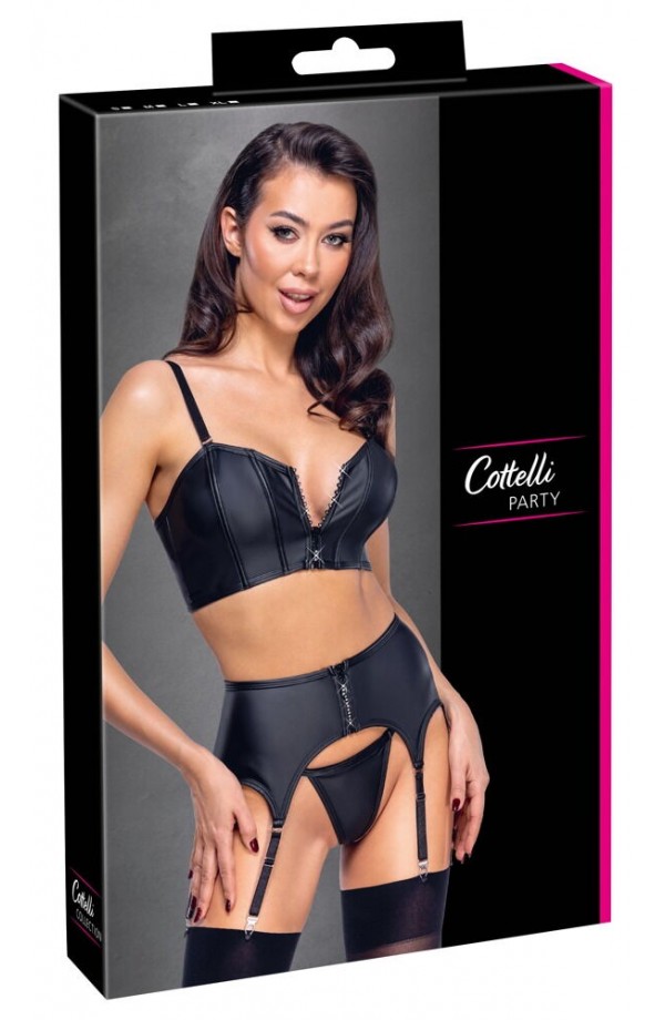 The black suspender set from Cottelli PARTY is made up of a corset top, suspender belt and string. The set is made out of classy matte look material. It is soft and stretchy for a very comfortable fit. The sparkly full-length zips at the front of the top and suspender belt are eye-catchers and they also make the set easy to put on too. The corset top has integrated shaping wires and an adjustable hook fastener at the back. The bra straps are also adjustable for a perfect fit and can be easily removed for a strapless look. The suspender belt has an adjustable hook fastener at the back as well. The 6 adjustable suspender straps can be removed. The small, classic matte look string completes this stylish trio.
