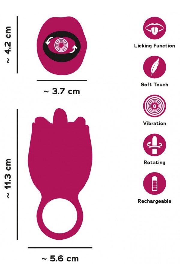 The compact tongue vibrator is easy to guide and can provide very precise stimulation as well, thanks to its practical ring-shaped handle. The silky soft silicone mouth caresses the clitoris, vulva, nipples, anus and other erogenous zones. The soft, circling, silicone tongue provides stimulation exactly as desired – from gentle to intense. A playful toy for intense moments of oral pleasure during solo and couple's fun!