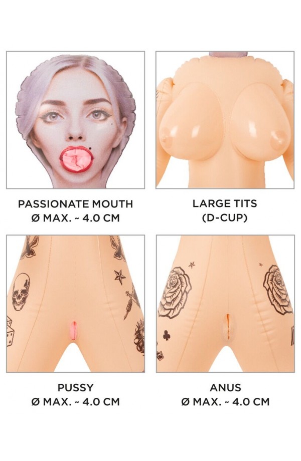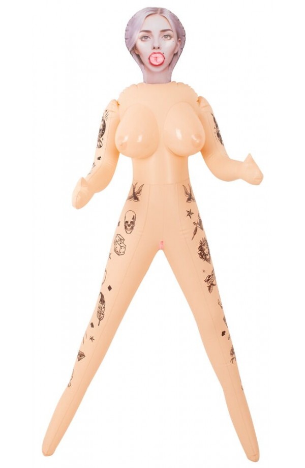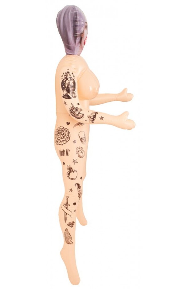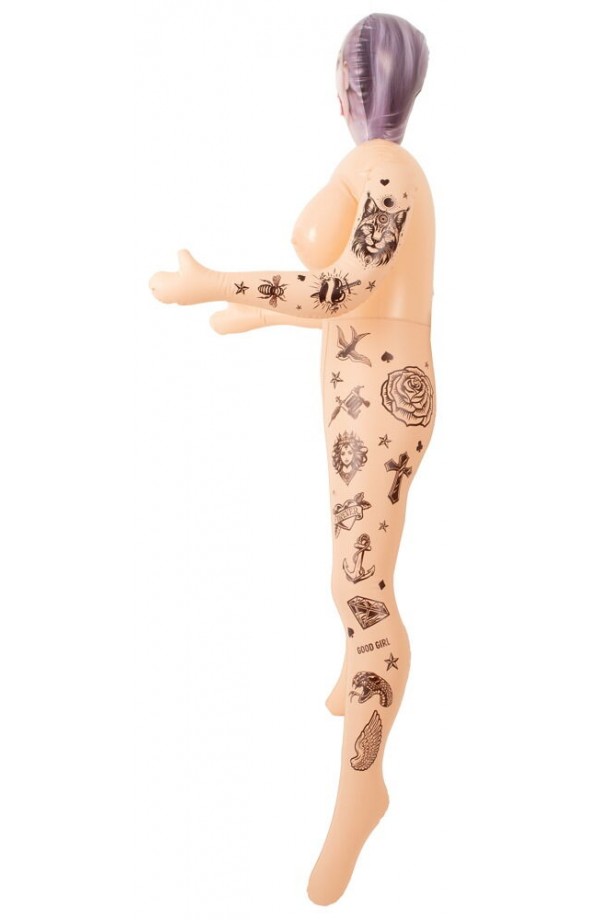 The inflatable, life-sized Tattooed Sex Doll from Naughty Dollz has a delicate figure and firm, extra large breasts. Her arms and legs are decorated with various cheeky tattoos. Her beautiful face and hair are printed on. She is in a standing up/lying down position and has 3 pleasure holes (delivered with a sealed vagina and anus).