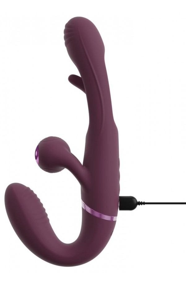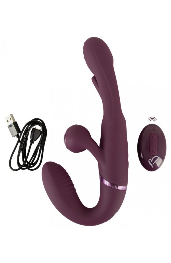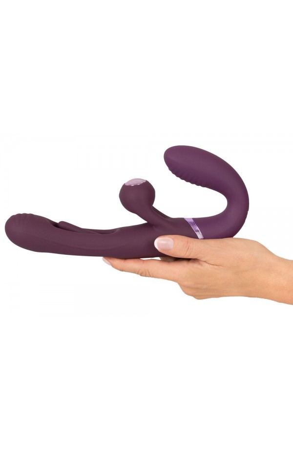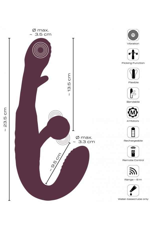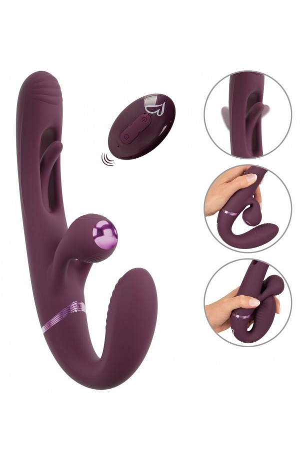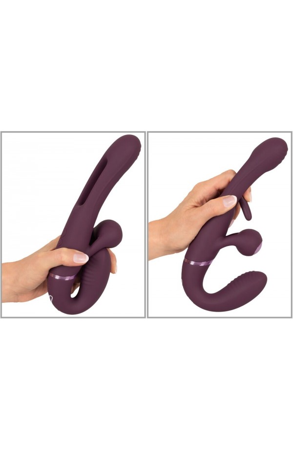 Strapless strap-on double vibrator Strapless – held in place by the intimate muscles With a practical remote control Vibrations for the internal and external pleasure spots Swinging tongue in the shaft (Flicking Tongue) 2 x 10 vibration modes – controlled separately Ball stimulator vibrates for both partners Flexible for lively play Wonderful shape for a secure fit in the vagina Velvety soft silicone Rechargeable – incl. a USB cable Give, take, enjoy – and control together! The RC Strapless Strap-On With Flicking Tongue from Javida is a wonderfully shaped double vibrator for hot roleplay, pegging and much more. The short grooved vibrator gets inserted into the vagina and is then held in place by the intimate muscles. Once it is in place, a partner can now be intensely pleasured by the longer Flicking Tongue vibrator. The external ball stimulator vibrates on both sides, so that both partners are pleasured at the same time on their external hotspots. Double the play for double the fun! The 4 strong but quiet motors provide reliable power. The functions can be easily controlled with the remote control (range 8 m) or directly on the toy. Each end of the double vibrator can be controlled separately. The short vibrator offers plenty of variety with its 10 vibration modes. The long vibrator's vibrations and the external ball stimulator are combined and supported by the intense & lightning-fast Flicking Tongue in the shaft. This stimulating combination also has 10 modes and can be easily controlled at the push of a button. The Strapless Strap-On Vibrator is wonderfully curved for a secure fit and firm hold in the vagina. It is also flexible, meaning that is fits perfectly during wear and use. The silky soft silicone ensures easy insertion and maximum comfort during double play. The vibrator with 2 ends can also be used for sensual solo play with synchronised stimulation. Rechargeable – includes a USB cable and a battery (CR2032) for the remote control. Total length 23.5 cm. Shorter vibrator insertion length 9.5 cm, Ø max. 3.3 cm. Longer vibrator insertion length 13.5 cm, Ø max. 3.5 cm. Weight 314 g. Silicone, ABS.