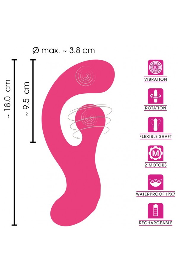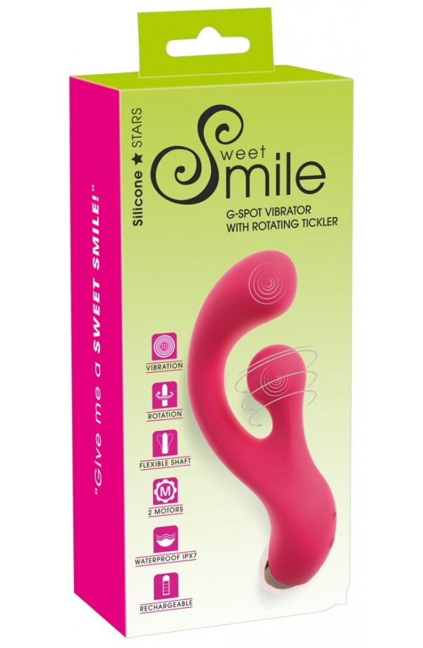 The lightweight, easy-to-use G-Spot Vibrator with Rotation from Sweet Smile stands out because of its double vibro-power and innovative rotation for incomparable clitoral stimulation. The wonderfully curved shaft with its large vibro-head provides spot-on G-spot pleasure, while the smaller soft round arm rotates so that it can caress the external hotspot. The velvety soft silicone rabbit vibrator is flexible, which means that it can adapt to double play and moves with every movement. The easy-to-use button control adds the final touch to the intense fun. Pure & perfect pleasure!