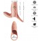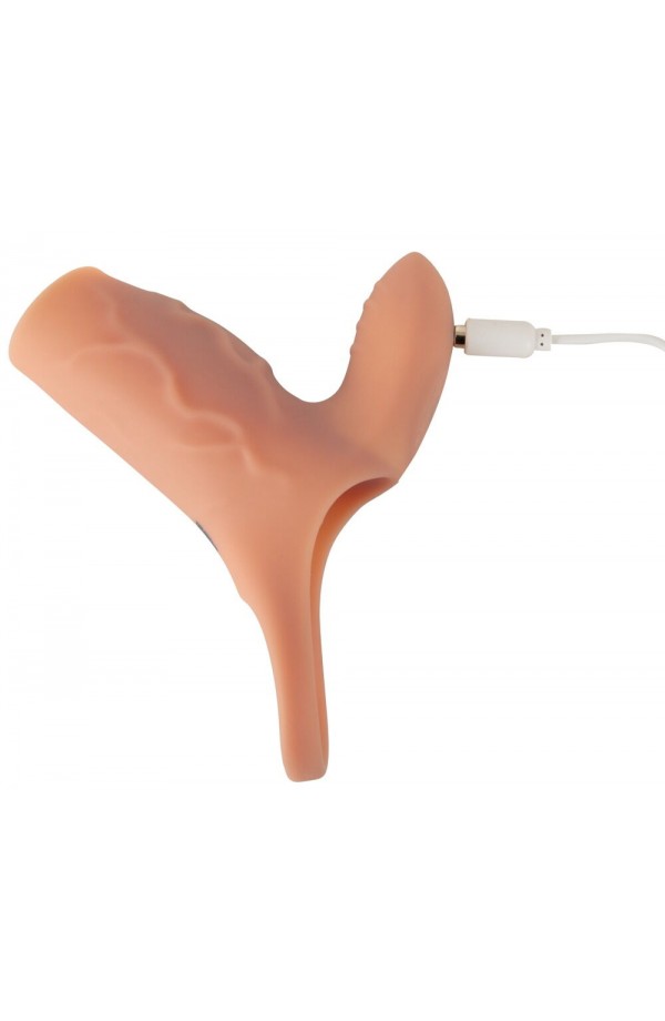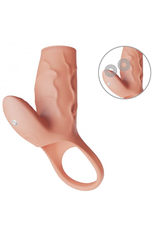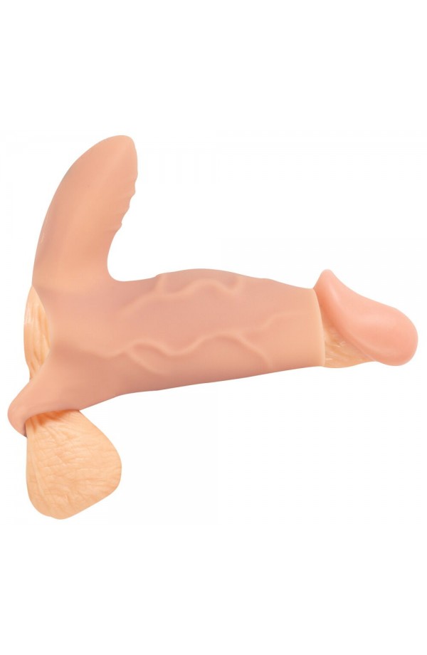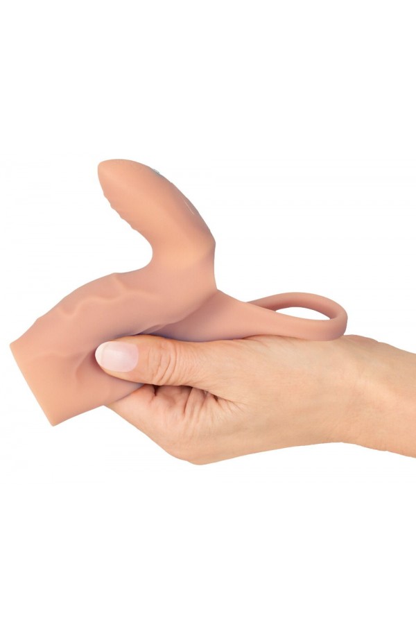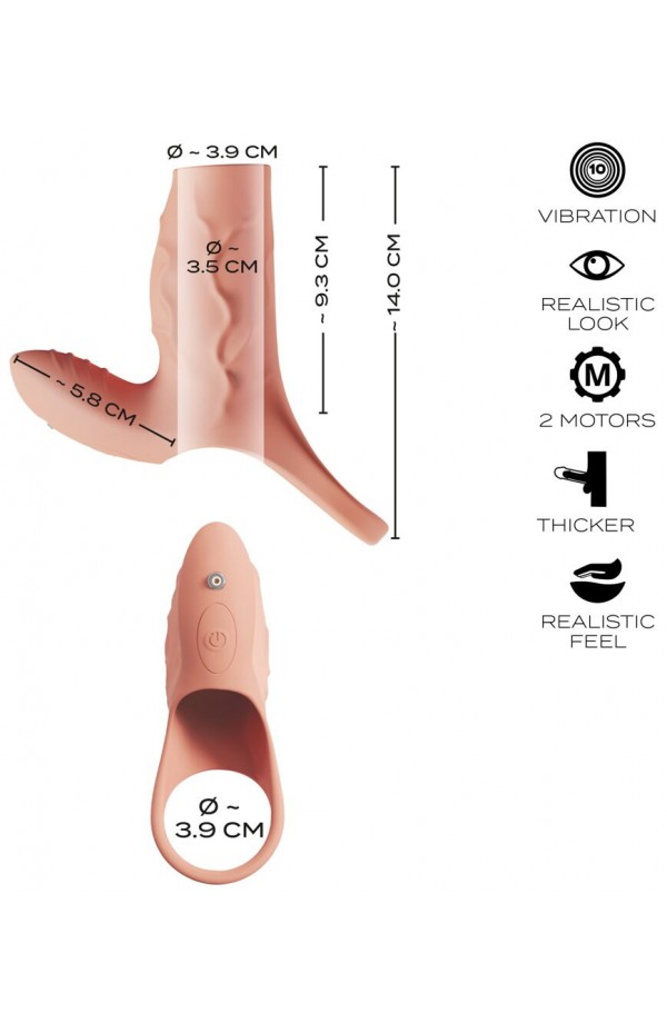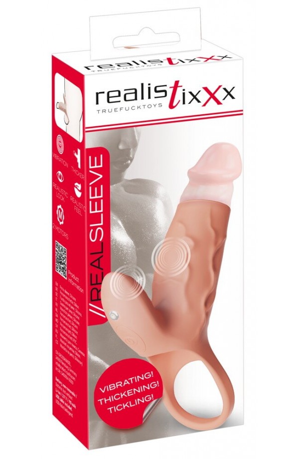 Vibro-penis sleeve with a ball ring Vibrating clitoral stimulator 2 quiet motors 10 vibration modes Thickens the girth of the penis Supports the erection Realistic look with veins Open at the front – suitable for every penis Velvety soft silicone Rechargeable – includes a USB cable Double pleasure for mutual climaxes! The penis sleeve, RealSleeve Clit from Realistixxx, gets a penis into top shape quickly and easily – for moments of intense pleasure. In addition to that, the powerful vibrations will pleasure both partners in an exciting and stimulating way. The 2 quiet motors make the sleeve and the clitoral tickler vibrate. There is the right mode for every mood and desire, thanks to the 10 different vibration modes. The modes can be easily controlled at the push of a button directly on the tickler. The tight-fitting, erection-supporting sleeve is simply slipped over the penis and is extremely comfortable to wear. The sensitive glans remains exposed for maximum sensation. The open sleeve is therefore suitable for any penis length. The stretchy ball ring ensures a firm, secure fit without slipping. The penis sleeve is made out of silky soft silicone and it stands out because of its delicate veins, extremely realistic appearance and soft, lifelike feel. It is very flexible, which means that it can fit tightly around any penis and noticeably increase the girth, thanks to the thickness of the material. The flexible clitoral tickler adapts to every movement and its pronounced grooves transmit the hotspot vibrations in a particularly targeted and intense way. Rechargeable – includes a USB cable. Total length 14 cm; penis sleeve 9.3 cm long, outer Ø 3.9 cm, inner Ø 3.5 cm (flexible); ball ring Ø 3.9 cm (flexible); tickler 5.8 cm long. Weight 72 g. Silicone.
