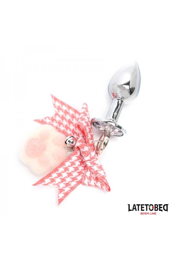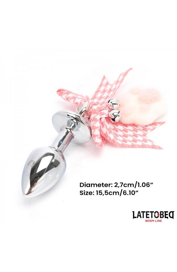 Feel adorable and sexy at the same time with this metal butt plug. It features a plaid bow, small bells, and a pink and white paw-shaped pompom.