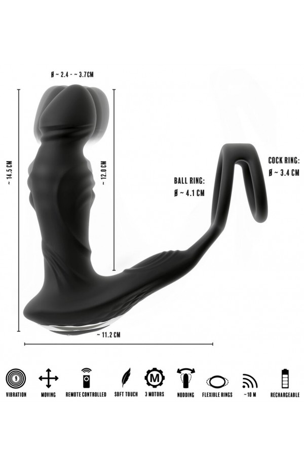 No less than 3 powerful but quiet motors are for the intense functions. The powerful vibrations in the plug's tip and the perineum stimulator are combined and can be controlled in 9 diverse modes. The massaging nodding tip and the moving ring massage are also combined and will provide pleasure in 10 different modes. The vibrations and massages can be controlled separately – either via the remote control or directly on the toy.