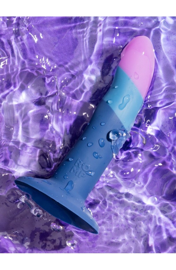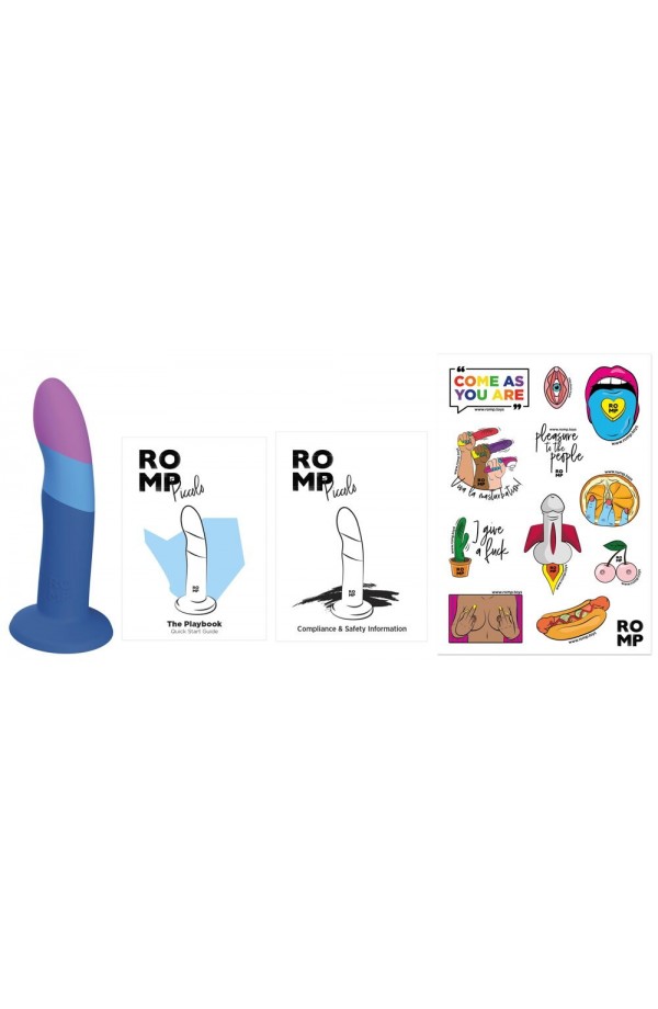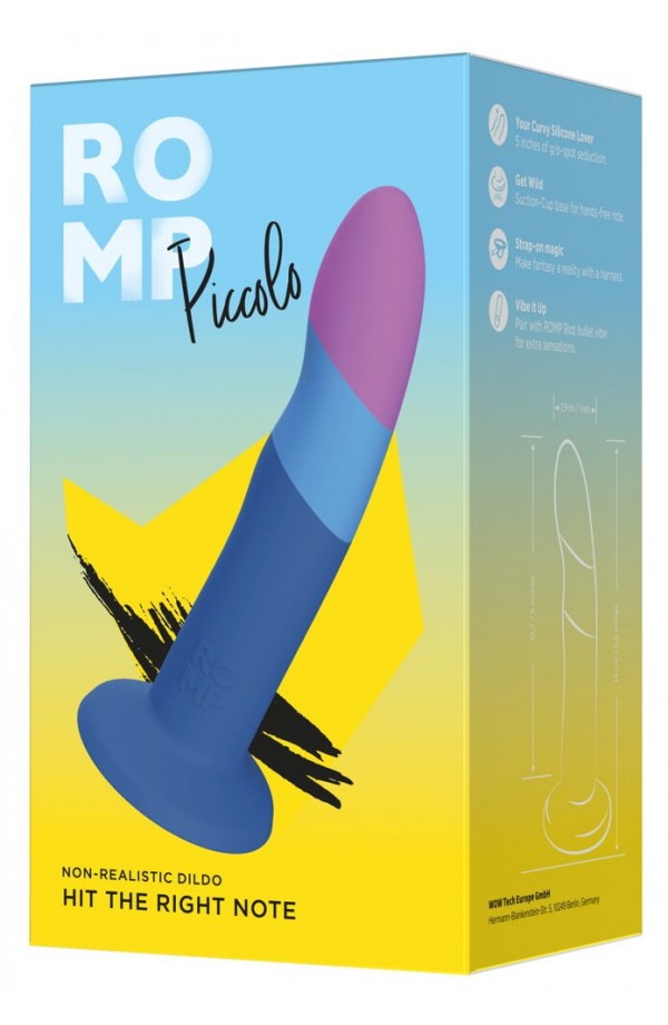 Wavy dildo with a strong suction cup Stylish colourway Silky soft silicone Perfectly shaped G-/P-spot tip Hollow shaft for inserting a bullet vibe (not included) Strap-on compatible For fun alone and as a couple! Excitingly shaped dildo Piccolo from ROMP in a stylish colour. With a strong suction cup that sticks firmly and securely to any smooth surface for hands-free pleasure. The dildo is also compatible with strap-ons and harnesses. It is ideally curved so that the G-spot or prostate can be easily reached and stimulated in a targeted manner. Made from silky soft silicone, which gives the dildo its exciting stiffness and hardness without losing any of its flexibility. The lower shaft is hollow so that a bullet vibrator (not included) can be inserted. Total length 14 cm, insertion length 12.7 cm, Ø 2.9 cm. Silicone.