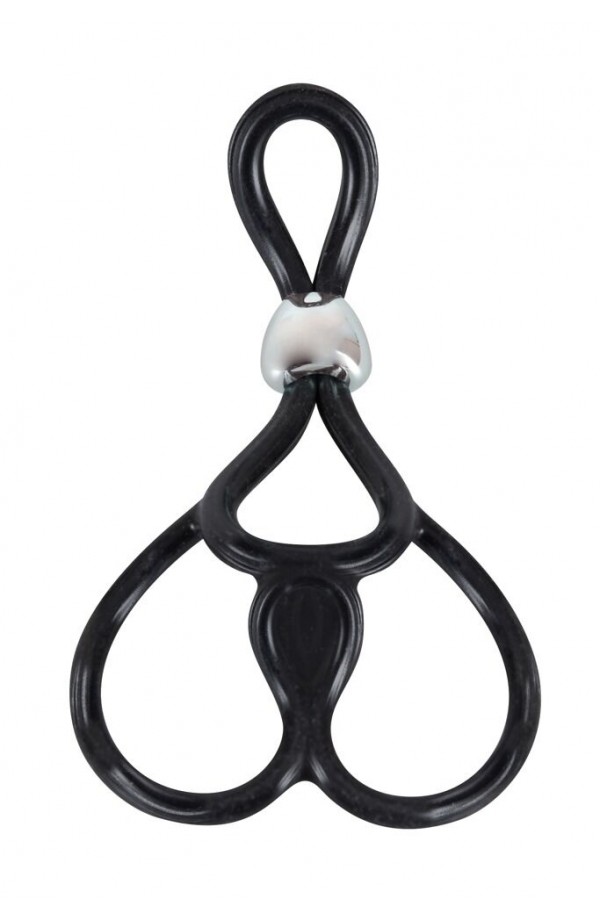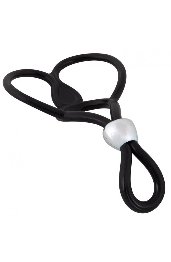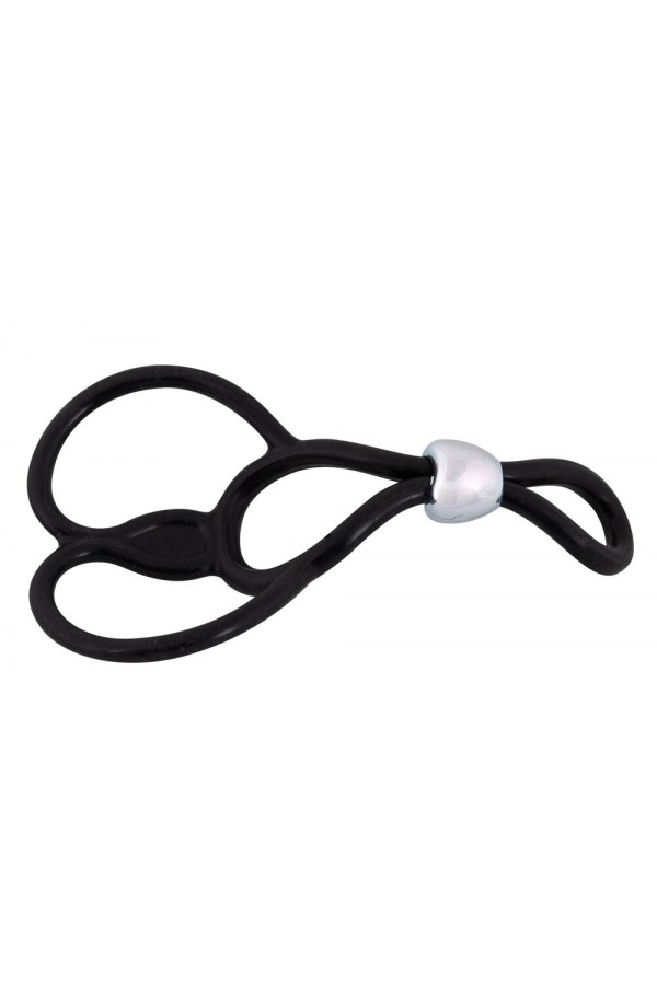 Cock ring with two testicle rings (Ø approx. 3 cm each, stretchable). Cock ring individually adjustable with the sliding bead. Total length approx. 13 cm. Black.