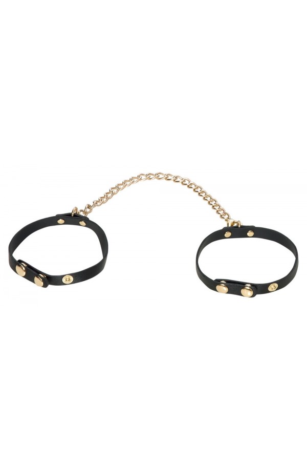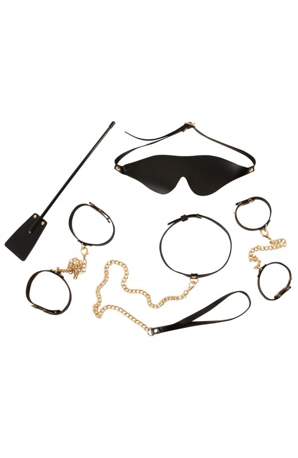 Elegant, 5-piece bondage set Stylish imitation leather, narrow straps Elegant gold-coloured accessories With restraints for the hands and feet With a collar and a leash With a blindfold and mini whip With adjustable buckle fasteners One side of the snap hook chains can be removed Perfect essentials Elegant bondage fun! The 5-piece Bondage Set from Bad Kitty is made out of delicate black imitation leather with gold-coloured accessories. It's a soft, elegant bondage set for curious people and connoisseurs. The set contains a leash, blindfold and mini whip for diverse games that are out of the ordinary. The elegant, narrow straps can be put on and adjusted quickly, thanks to the buckle fasteners. The leash and other chains have a snap hook on one side. This set contains: 1 pair of handcuffs with a 17 cm long connection chain 1 pair of ankle cuffs with a 21 cm long connection chain 1 collar with a chain leash, 1 blindfold 1 mini whip (30 cm long). Polyurethane, metal.